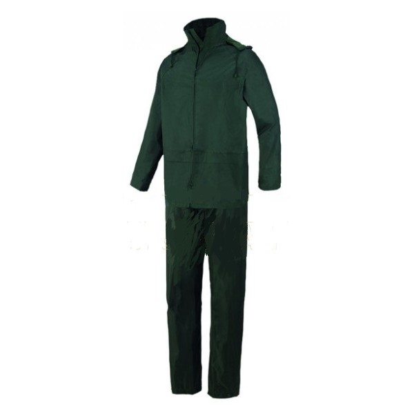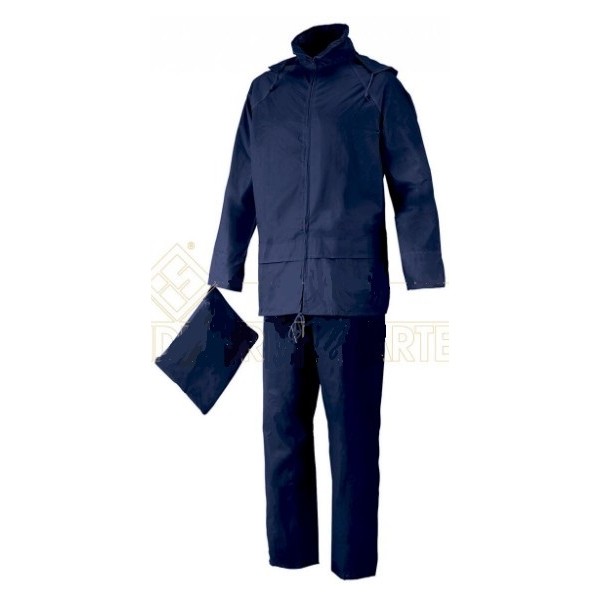 GIACCA: cappuccio fisso interno al collo, aerazione sul dorso e sotto le ascelle, chiusura con cerniera in plastica, maniche con soffietto controvento, due tasche con pattina antipioggia. Cuciture nastrate.