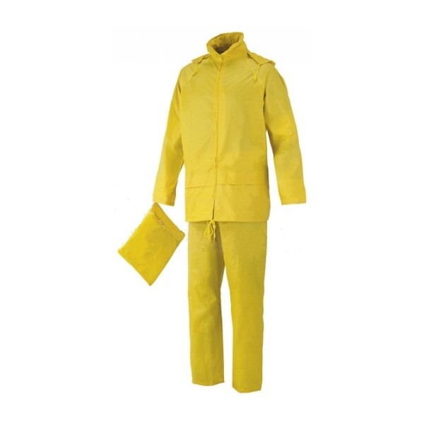 PANTALONE: con elastico in vita, due passaggi mani, bottone al fondo. Cuciture nastrate. Il tutto ripiegato in una pratica busta con cerniera. Composizione: poliestere spalmato PVC